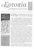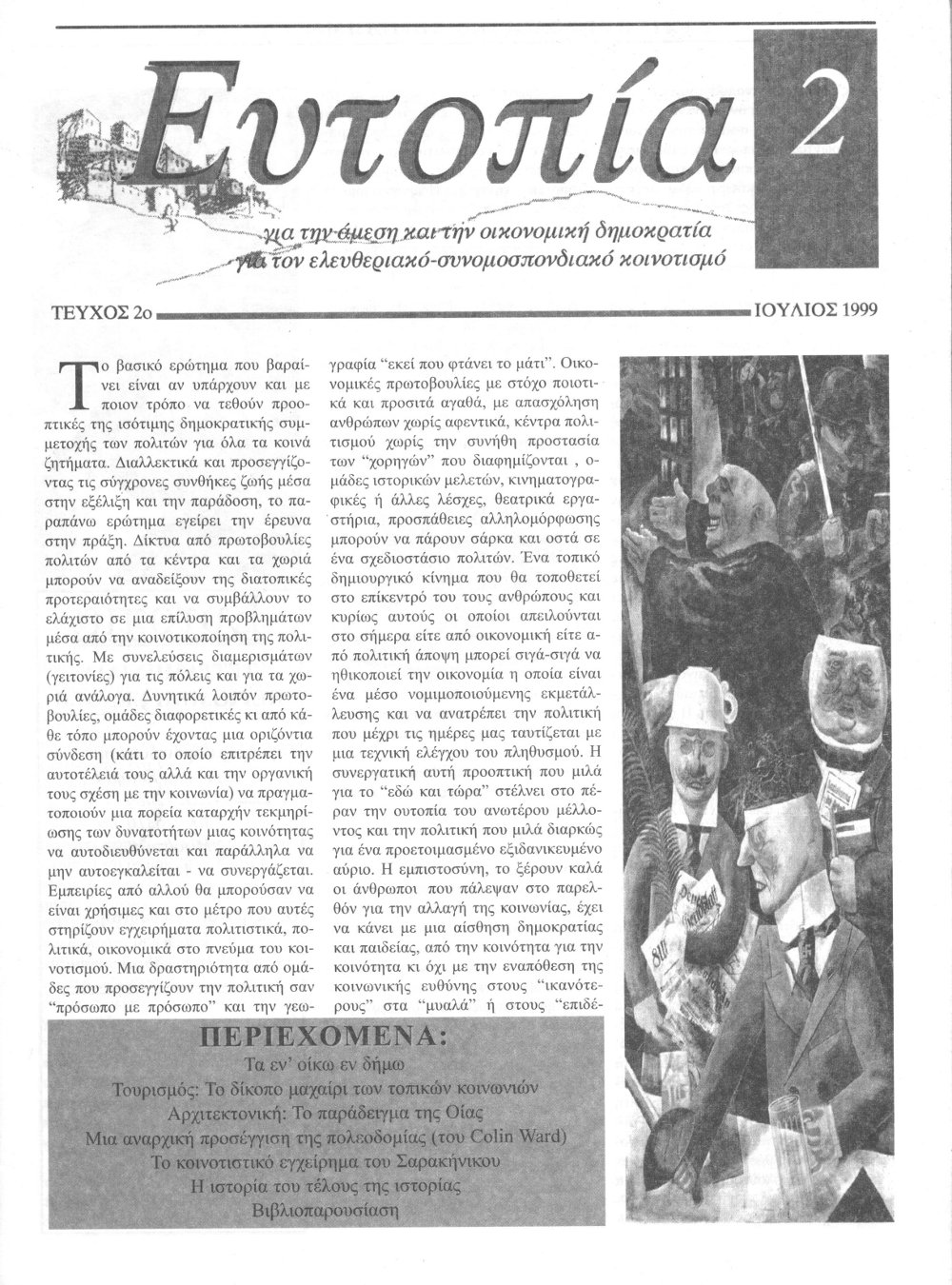 Εξώφυλλο Τεύχος 02 Ημερομηνία Ιούλης 1999 Περιεχόμενα τεύχους Τα εν οίκω εν δήμω, αναδημοσίευση από το περιοδικό Γη και Ελευθερία Τουρισμός: το δίκοπο μαχαίρι των τοπικών κοινωνιών Αρχιτεκτονική: το παράδειγμα της Οίας Μια αναρχική προσέγγιση της πολεοδομίας, του Colin Ward από το βιβλίο 'Talking Heads' Το κοινοτιστικό εγχείρημα του Σαρακήνικου Η ιστορία του τέλους της ιστορίας Βιβλιοπαρουσίαση: Η ιστορία των ουτοπιών- Λιούις Μάμφορντ